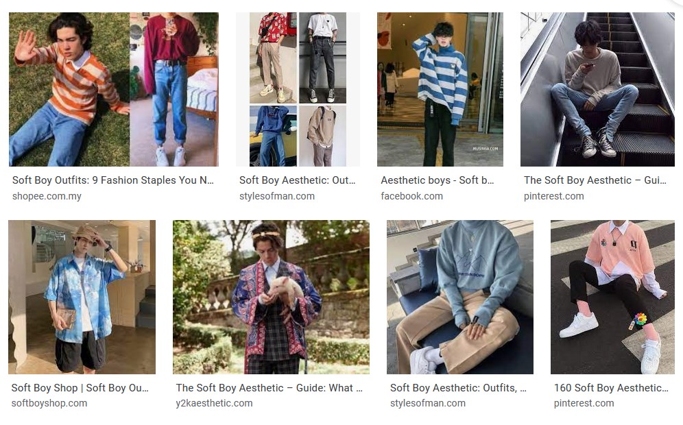 Soft boy I believe is even more complicated as a meaning <lol>! In general, soft boy with a quiet and vulnerable personality. The clothing he uses to dress with is the same with the soft girl aesthetic but with masculine clothing. I hope the images below help you understand fully the concept!